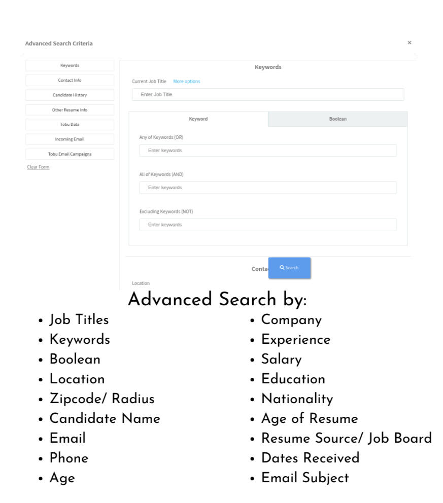 Tobu goes far beyond simple keyword searches to find the best fit for your criteria to a high degree of detail in seconds. For ex: Top Java Developers, 3-6 years experience within 50 mile radius of Zip 90210
