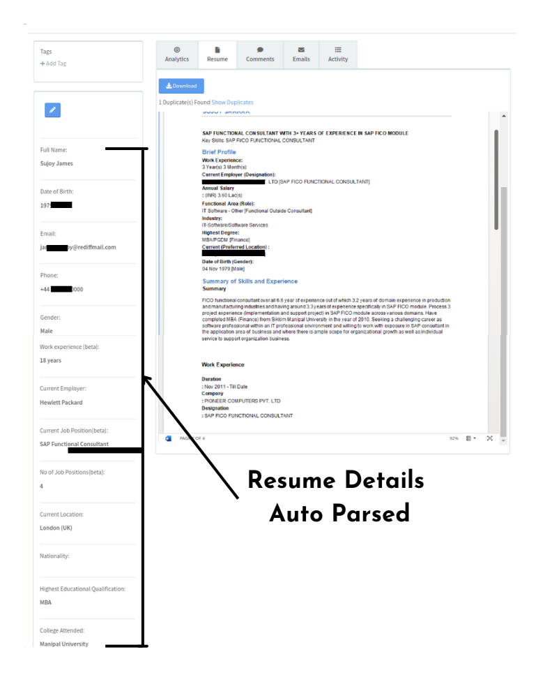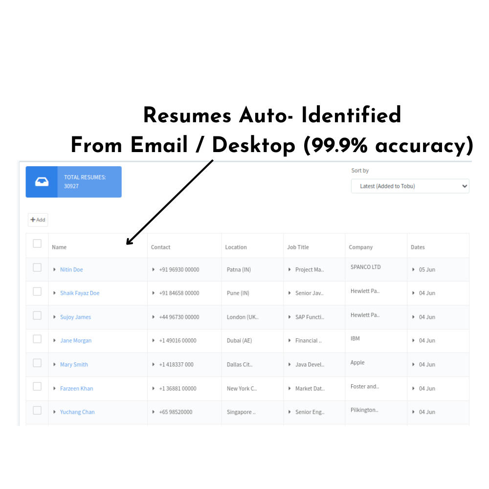 No manual entry. Tobu's powerful AI based parsing engine auto identifies Name, Email, Phone Numbers, Locations, Experience etc. and de-duplicates your resumes. This allows you to extract excel downloads of candidate received automatically.