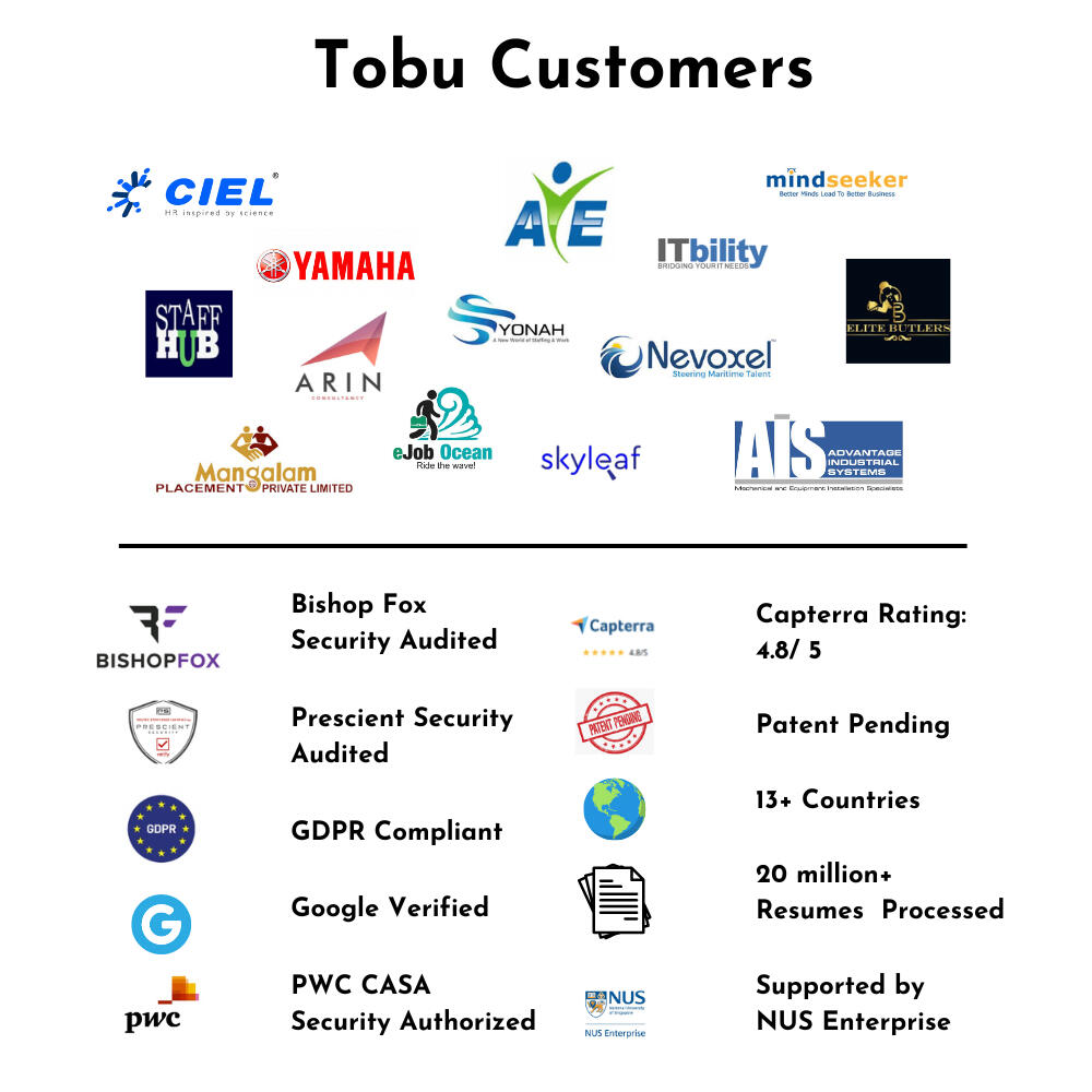 'I have literally tried over 15 softwares for recruitment and yours and bullhorn is definitely best, maybe even better than bullhorn because yours is so straightforward' - Jackie, Talent Inc, Canada'Tobu has been a game changer for my staffing company! I had been looking for an easy to use intuitive CRM recruiting tool for years and finally found it. Support and customer service is outstanding. ' - Chris Bailey, Mindseekers, USA
